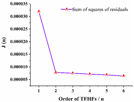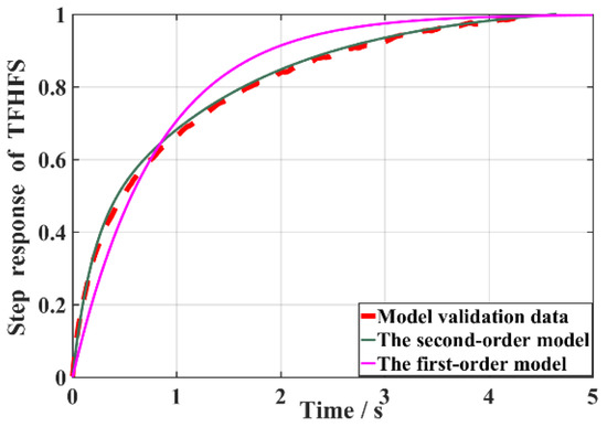 According to the variation trend of with order , decreased greatly compared with , while , , , and changed relatively little, as shown in Figure 10. Using the model-order estimation criterion based on the sum of squares of residuals, it can be concluded that the model order of the TFHFS is 2. Since the QR decomposition method obtained the order and the model parameters of the system at the same time, it was easy to obtain the transfer function model of the TFHFS, as shown in Equation (11). If the TFHFS is regarded as a first-order system, then the transfer function model obtained by using the same method is , as shown in Equation (12). Compared with the model validation data, the fitting degree of the second-order model is 98.61%, while that of the first-order model is only 82.54%, as shown in Figure 11. Therefore, the second-order transfer function model established for the TFHFS is more reasonable than the traditional first-order model.