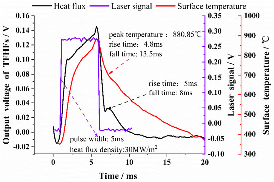 In order to optimize the thermal protection design of aero-engine hot-end components, it is necessary to explore the transient relationship between the surface heat flux and the surface temperature under a large heat-flux impact state. With this in mind, the experimental pulse width of the modulated laser, the laser power, and the heat flux density were 5 ms, 6000 W, and 30 MW/m2, respectively. With these parameters, the surface temperature of the TFHFS was then detected by a high-speed infrared radiation thermometer, and a photodetector detected the laser signal.