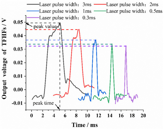In order to test the transient response characteristic of the TFHFS, the laser power was reduced to 3000 W, and the heat-flux density was 2. Due to the large number of experiments, the laser power was reduced in order to avoid the sample being damaged. In the experiment, the function generator was successively used to modulate the pulsed laser signal of 3 ms, 2 ms, 1 ms, 0.5 ms, and 0.3 ms to complete the transient calibration of the TFHFS. The test curves are shown in Figure 13, and the results show that under the same laser power, there exists a direct relationship between the pulse width and the amplitude and the transient response time (). When the pulse width decreased to 0.3 ms, the sample did not respond in time. Experimental results showed that the transient response time of the TFHFS, under the impact of a large heat flux, can reach 0.31 ms under the existing test conditions, as shown in Figure 13.