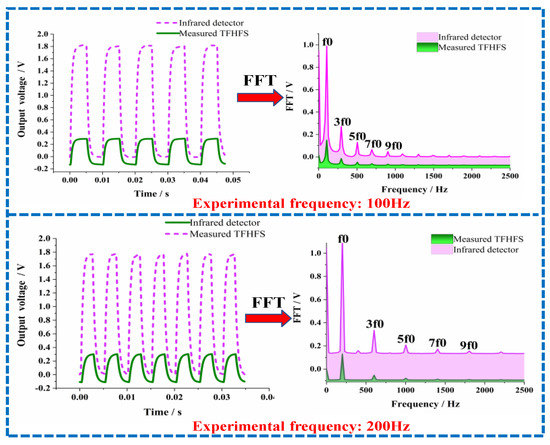 This study used 100-Hertz and 200-Hertz laser signals to complete the dynamic calibration experiment in a frequency domain. The heat-flux density was 3 MW/m2, and the sampling rate was 10,000 Hz. The sample time series and spectral distribution under two different square-wave frequencies are shown in Figure 14. The symmetrical periodic square-wave heat-flux signal was used in the experiment, whose pulse width was exactly half of the period. For the ideal symmetric periodic square-wave signal, after Fourier transform, the even harmonics of the signal fell to value zero of the spectrum envelope, so that its spectrum contained only fundamental and odd harmonics components. The experimentally obtained Fourier amplitudes of the even harmonics were not zero but close to it, as shown in Figure 14.