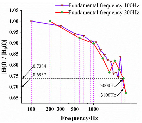According to the FRF method, as shown in Equations (16) and (17), the calculation process of the amplitude–frequency response is shown in Table 3, taking the experimental data of 200 Hz as an example. When attenuated to 0.707, the response frequency,, of the TFHFS was in the range of 3000 Hz to 3400 Hz. In order to further confirm the response frequency, the experimental frequency was adjusted to 100 Hz. Using the same method, the response frequency of the TFHFS could further be determined to be between 2900~3100 Hz. Based on the data in Table 4, the amplitude–frequency response characteristic curves of the two groups of experiments are plotted in Figure 15.