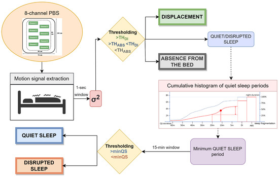 A multi-scale algorithm using motion signal was designed to assess the sleep quality on the two different datasets. The pipeline can be divided into different steps with the purpose of identifying different states during sleep and analyze their trends at different time scales. After the extraction of the motion signal and the pre-conditioning, the thresholding method is applied to recognize different kinds of activity in various scenarios. Specifically: represents the threshold below which subject’s absence from the bed is identified and is the threshold above which displacements due to subject movements are detected. Afterwards, a multi-scale analysis based on the cumulative histogram of quiet sleep periods is performed to analyze sleep fragmentation to recognize quiet and disrupted sleep. The evaluation is based on prolonged periods of absence of displacements, identified through that represents the minimum duration considered for a quiet sleep interval. A summary of the pipeline is shown in Figure 1.