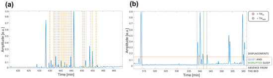 Figure 2. Example of motion signals on time intervals of about one hour of the rec. 2. In (a) the labeled apnea events are shown. Brown dashed lines represent the event starting, while yellow dashed lines the ending. In (b) the two thresholds are shown to highlight the different sources of noise. In particular, (horizontal line in red) is the threshold above considering displacements, whereas (horizontal line in gray) is the threshold below considering absence from the bed because of the reduced activity due to the only external noise. The activity between the two thresholds highlights the period spent lying on the bed that can identify QS and DS. Furthermore, a long time interval identifying QS is highlighted between the two dashed blue vertical lines, while a short time interval identifying DS is shown between the two dashed green vertical lines.