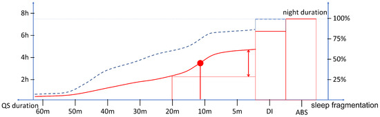 In Figure 3, the expected cumulative histograms of QS periods in possible disturbed and healthy good sleep cases are shown. Specifically, it is possible to analyze how much time the subject has spent in periods of QS long at least a certain duration (indicated on the x-axis). Reducing this interval, the cumulative duration increases until it is matched to the recording duration. Indeed, the scale of durations is followed by DI and ABS durations which complete 100% of the cumulative. For this reason, the axis is oriented from long to short periods of QS. It is worth noting that the axis starts from periods of 60 min, because an occasional interruption of a longer period does not affect the estimate. It is worth noting that high slope points are marking the step-up of QS interruption below the given duration. This may be a marker of repeated disturbances (e.g., SAHS events or myoclonus) with a period equal or shorter than the step-up point.