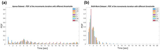 Probability Density Function (PDF) of the displacements duration in the Apnea Dataset (a) and the Shift-Work Dataset (b). The durations were obtained setting thresholds at 0.01, 0.05, 0.1, 0.2, 0.3, 0.35 and 0.5.