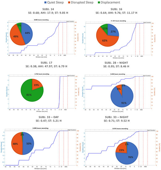 The typical sleep pattern is characterized by regular REM/light/deep sleep cycles, thus, it is expected to present no movement other than spontaneous ones occurring during transitions from REM and to result in a modest percentage of fragmented sleep. Conversely, distinct characteristics can be expected and investigated on the cumulative histogram of QS according to the different pathological/disturbed sleep. For example, major percentages of sleep constituted by short periods of QS or significant durations of ABS can be expected in SAHS or insomnia, respectively.