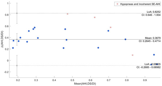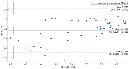 Afterwards, the agreement between SE and QS and AHI and DS/DI was specifically evaluated through Bland–Altman plots reported in Figure 6 and Figure 7, where uncertain recordings were also marked.