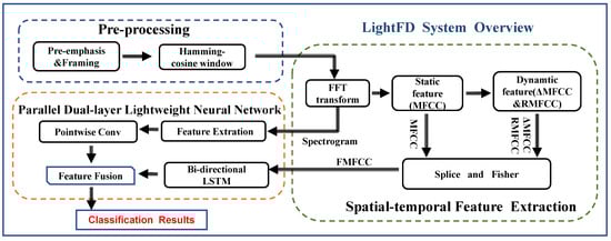 LightFD is a real-time power transformer fault diagnosis system, whose architecture diagram is shown in Figure 1. It consists of three components: signal pre-processing, spatio-temporal feature extraction, and parallel dual-layer, dual-channel lightweight neural-network-based classification. Pre-processing consists of pre-emphasis, framing, and windowing. We used acoustic features obtained from short-term Fourier transformation as acoustic spectrograms and Filtered-MFCC (FMFCC) by splicing and filtering static features with dynamic features. Spectrograms and FMFCC are visual features and time-dependent features, respectively. Finally, we designed a parallel dual-layer, dual-channel lightweight neural network for edge devices to guarantee the speed and accuracy of diagnosis.