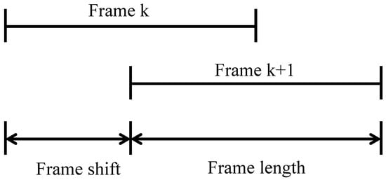 The sound signal is a non-stationary signal [] that usually remains stable between 50 and 200 ms. Therefore, features are extracted for frames whose frame size is within this range. To achieve a smooth transition between frames, a 50% overlap between consecutive frames is usually used in feature extraction. In our work, a frame is considered as a sample. The process of framing is to divide the pre-emphasized signal into multiple samples. Figure 2 shows the relationship between frame shift and frame length. A window function [] is a function used to reduce signal interruption at the beginning and end of each frame. This is done by considering the next frame and integrating the frequency lines, thus making each frame smoothly interconnected.