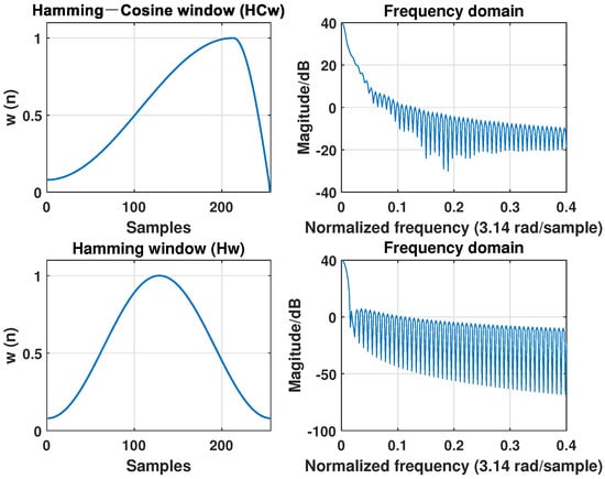 The window function is characterized by its main lobe width and side lobe decay speed. The main lobe width and the attenuation of the side lobe affect the frequency resolution simultaneously: the smaller width of the main lobe and the faster the attenuation of the side lobe, the stronger the resolution of the frequency and the smaller the degree of leakage []. Therefore, to balance the tradeoff between the width of the main lobe and the width of the side lobe, as shown in Figure 3, we chose the Hamming-cosine window function [], which has a wider main lobe than the Hamming window function, but a side lobe that decays faster.