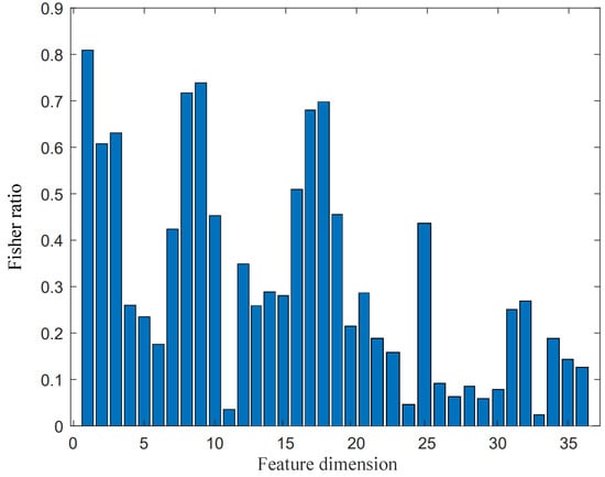 The above feature parameters characterize different perspectives of sound signals from a power transformer. Considering the variation of the transformer’s operating state, we combined both static and dynamic features to describe the transformer’s sound signals. Directly superimposing the above features (36 dimensions) would increase the computational effort, as well as the number of dimensions of the feature parameters. Some parameters may contain less information, and some contain redundant information, which may affect the result of fault diagnosis if the contribution of these feature parameters is considered to be equal. Therefore, we should evaluate the degree of influence of each dimensional parameter on the recognition effect and select the parameters with the greatest influence on the recognition as the new feature parameters. Specifically, we combined the above static features and dynamic features together and obtained the contribution of each dimension by calculating the Fisher ratio of the feature dimensions.