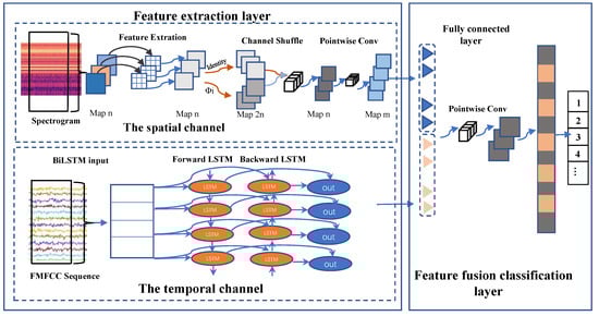 The feature extraction layer consists of the spatial channel and temporal channel, using the depth-separable convolution and recurrent neural-network-based Bidirectional Long Short-Term Memory (BiLSTM), respectively.