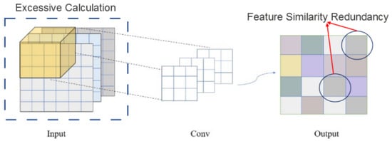 where ∗ is the convolution operation, is the input data (n denotes the number of input channels, and h and w are the height and width of X, respectively), and b is the bias term. As shown in Figure 6, the output feature maps of the convolutional layers often contain a large amount of redundancy. To reduce the redundancy of the convolution operations, we utilized the redundancy of the existing feature maps. As such, the redundancy is used to generate similar feature maps to obtain multi-channel (e.g., feature channels) feature maps (feature maps of n feature channels obtained by some linear operations):