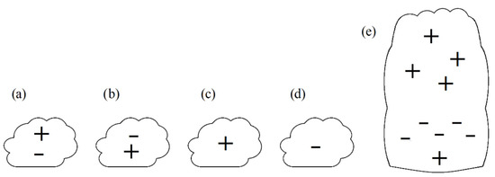 The third zone—the inside of the cloud—can be characterized by an increased rate of electric charge accumulation and negligible charge loss; thus, Formula (8) is reformulated into the following [