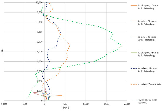 It can clearly be seen that the maximum values of the electric field strengths for all cases are significantly higher for the ‘dynamic’ cases, where the external electric field in the cloud and in cloud proximities is influenced by a long electrically charged object of different conductivity—the cloud, to maintain its equilibrium according to general Formula (14), for a changing conductivity elevates the electric field strength in the region where the disturbance takes place, as in Formula (16). As the local differences in conductivities reach many degrees of magnitude (air/cloud vs. aluminum), the local electric field strengths are expected to locally increase significantly to compensate for this, according to the assumed aforementioned mechanisms; hence, there are large differences in the E values between the models. For the Sc clouds, the ‘static’ model of electrification presents electric field strengths rarely exceeding 0.5 kV/m, while for the ‘dynamic’ charging model, the values may reach up to 30 kV/m for both Sc and Ns clouds—despite their significant differences in initial electric field strengths, as shown in