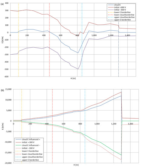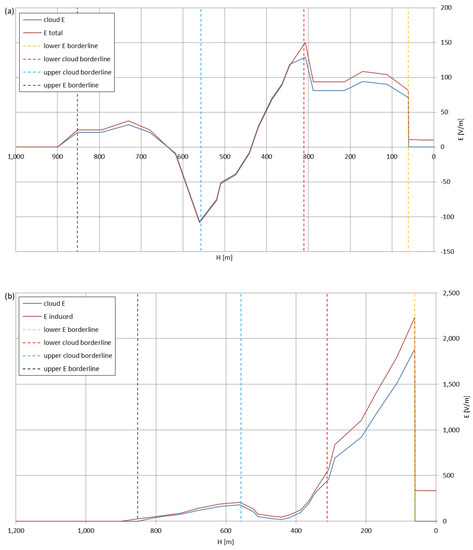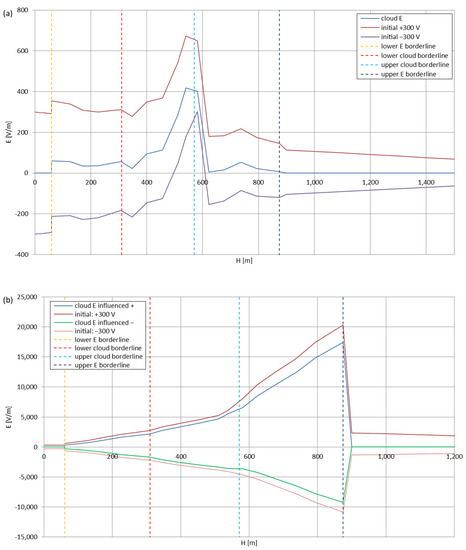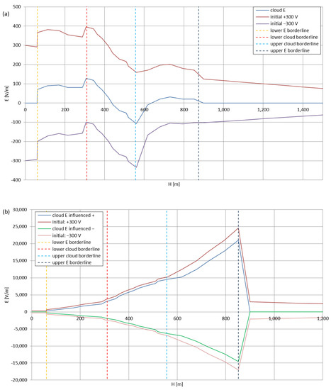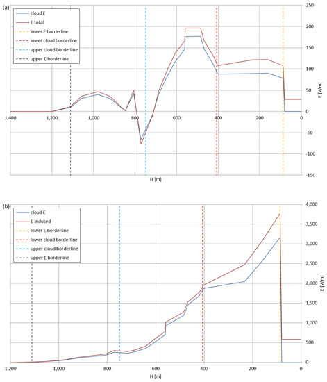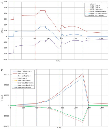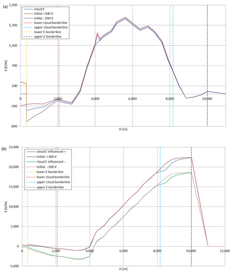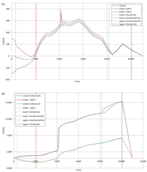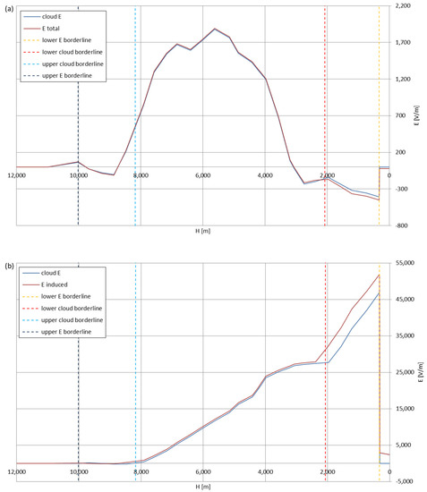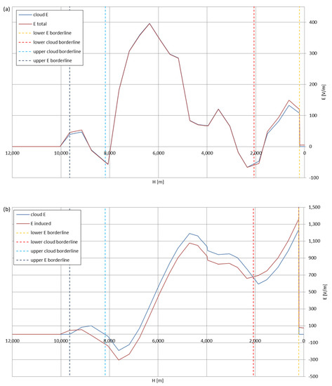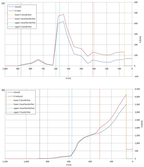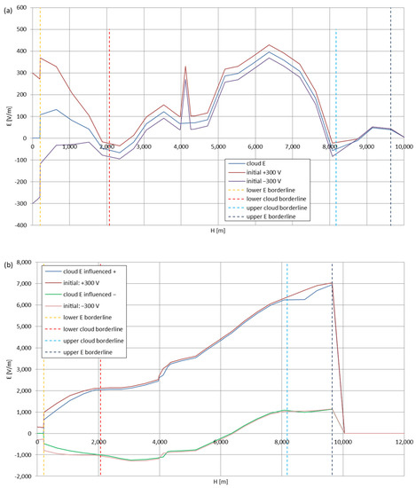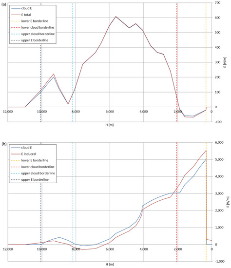 E function. For all cases, the electric field strength drops rapidly after the exit from the zone with external electric field in proximity to the cloud—a result of the increased conductivity of the surrounding air. For the Ns clouds, an increase of the electric field strength can be seen after the exits from the cloud regions (above the upper cloud borderlines)—the effects of changing electric charge accumulation mechanisms. The ‘static’ model clearly shows the electric field strength increase due to freezing of the water residue at the 0 °C isotherm (E value peaks repeating in ‘(a)’ plots shortly above 4000 m of altitude)—this mechanism is perceptible in the ‘dynamic’ model as short increases of the E’s derivatives, which moderately accelerate the electric field strength growth.