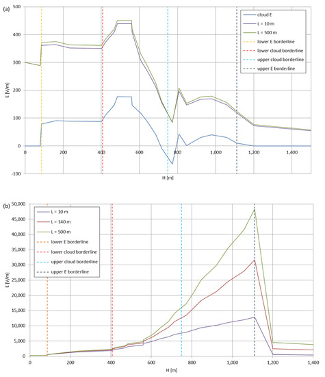 L = 140 m). For comparative purposes, a calculation of results for two lengths of wires—10 and 500 m—was also carried out. The calculated electric field strengths were summed with the external electric field strength in order to correspond to the worst-case scenario, where the total electric field strength may appear high enough to induce discharges.