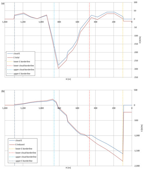 r, is a variable dependent on the actual shape of the cloud and the position of the equipment in relation to the cloud’s electric charge concentrations (if assumed that they could be considered as the ‘2nd electrodes’). The exemplary experimental electric field strength data used in this comparison do not indicate any more information related to the geometry of the measuring equipment/environment (e.g., the distance between the probes), presenting the electric field strength values only. If the aforementioned assumption is maintained and a simulated (or experimental) cloud shape is delivered, a distance, r, could be introduced as a defined non-unitary value; however, this would limit the usefulness of the calculations, as the considered clouds present a lack of repeatability in this geometric scale (except their general types and substructures). Hence, the unitary value of the distance, r, was assumed.