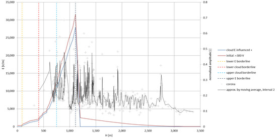 Section 2.1—this, however, does not necessarily mean that the corona is not likely to appear on the wire, as the presented electric fields have been calculated at a fixed distance r of 1 m—in the local zones closer to the surface of the wire, the electric field strength may reach the corona breakdown value. This is most likely in the approximate altitude ranges read from the plots (common for given model and flight stage):