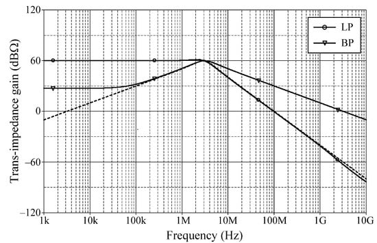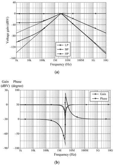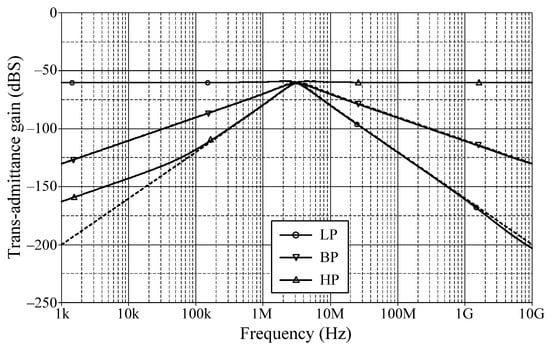 It is important to note from Equation (27) that the ωo can be electronically tuned by changing the transconductances gmA and gmB. In addition to Equation (28), the high-Q universal filter can be easily realized by tuning the resistor R without affecting the characteristic frequency ωo.