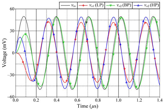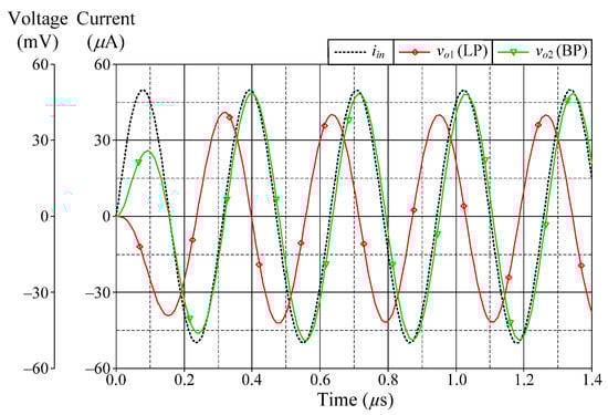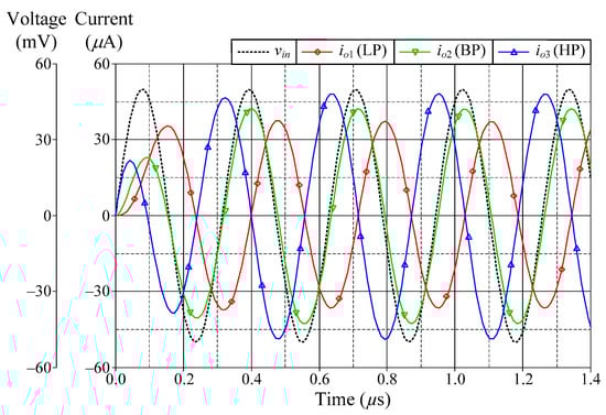 The suggested mixed-mode universal filter in Figure 3 was performed with gmA = gmB = gmC = 1 mA/V (IBA = IBB = IBC = 80 μA), and R = 1 kΩ, to actualize all the four-mode universal filter responses with fo = 3.18 MHz and Q = 1. Figure 6, Figure 7, Figure 8 and Figure 9 illustrate the simulated and theoretical frequency responses of VM, CM, TAM, and TIM filters, respectively. The disparity between simulated and theoretical gain responses in the HP filters of VM, CM, and TAM, as well as the BP filter of TIM, is greater in the low-frequency range of roughly 1 kHz to 100 kHz. This phenomenon may be explained by the fact that the input or output signals of the circuits were sensed with C2 and R, introducing an undesirable pole that caused significant deviations in low operating frequencies. In Figure 6c and Figure 7c, the phase shifting between input and output signals was measured as −190.70° and −192.74°, respectively, and the gain response was 0.84 dBV and 1.067 dBA down from zero for the frequency ranges varying from 1 kHz to 1 MHz. The simulated fo and corresponding percentage errors are given in Table 3. It is to be observed that all simulation results are found to be in good consistent with the theoretical values. Figure 10, Figure 11, Figure 12 and Figure 13 depict the transient responses of the proposed filter to the following input signals: (i) a 3.18 MHz sinusoidal input voltage signal with an amplitude of 100 mV (peak-to-peak) applied to the VM and TAM filters; and (ii) 3.18 MHz sinusoidal input current signal with an amplitude of 100 μA (peak-to-peak) applied to the CM and TIM filters. Table 4 shows the total harmonic distortions (THDs) and DC components of the VM, CM, TAM, and TIM outputs in Figure 10, Figure 11, Figure 12 and Figure 13. As can be seen, the THD value is less than 1.92% in all four modes. Thus, there is no significant distortion in the biquad design. The entire power consumption of the circuit was 1.31 mW at ±0.9 V biased voltages.