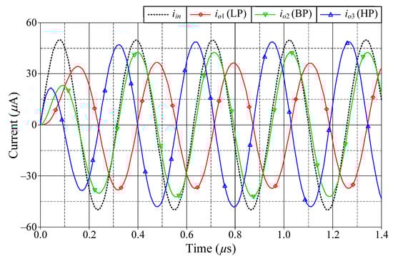 Time-domain responses of the LP, BP, and HP filters in CM.