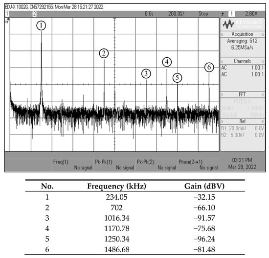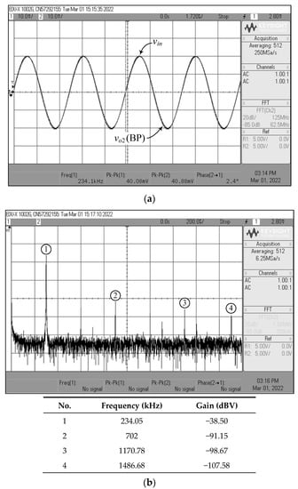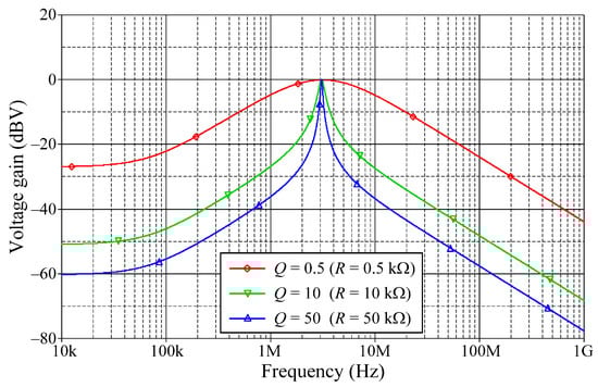 In addition, the orthogonal tunability of a high-Q value for a BP filter in VM is shown in Figure 14. The filter is designed to operate at fo = 3.18 MHz with gmA = gmB = gmC = 1 mA/V. By simply adjusting the R value for 0.5 kΩ, 10 kΩ, and 50 kΩ, the BP responses with various Q values of 0.5, 10, and 50 are achieved, respectively. Based on the measured data, the Q value was evaluated as 0.495, 8.273, and 44.25, respectively. The relative variation of the Q factor remained less than 12%, even when Q reached 50.