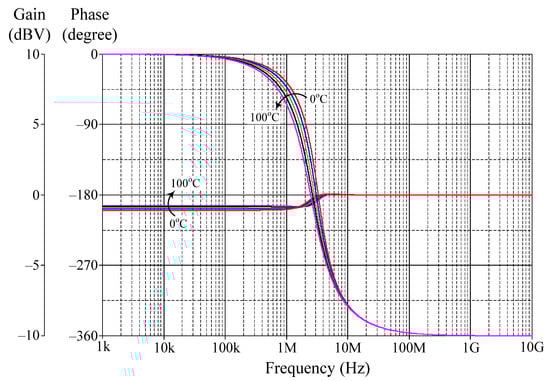 The effect of temperature variation on the filter parameters is now being investigated. For this purpose, the proposed filter was simulated under ambient temperature changes ranging from 0 to 100 °C with a step of 25 °C. Figure 15 demonstrates the gain and phase variations of the AP filter in VM operation. The findings reveal that, for different temperatures, the gain and phase at fo vary from −0.44 to −0.5 dBV and from −172 to −223°, respectively.