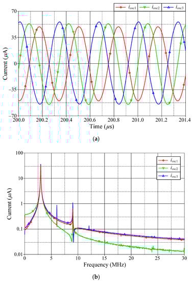 According to Equation (33), the phase differences between iosc1 and iosc2, as well as iosc1 and iosc3, are 90° and 180°, respectively. This demonstrates that the three output currents are not only 90° out of phase, but also 180° out of phase.