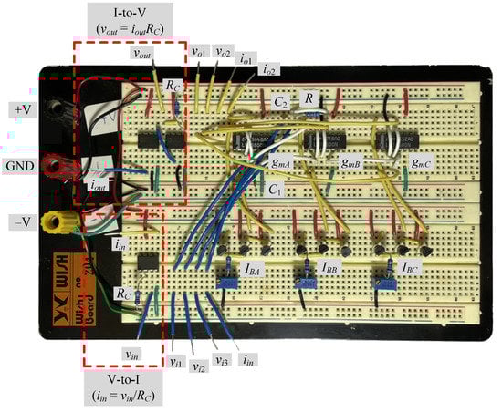 μ is the effective channel electronic mobility, Cox is the gate-oxide capacitance per unit area, and W and L are the respective channel width and length of M1k–M4k. Because each transconductance gik is proportional to the square root of the bias current IBk, the value of gmk may be electronically scaled using Equations (2) and (3). A current-controlled voltage amplifier is also accomplished in Figure 2 by a pair of transconductors M1B–M4B and M1C–M4C with a voltage gain of β = vw/vz+ = gmB/gmC.