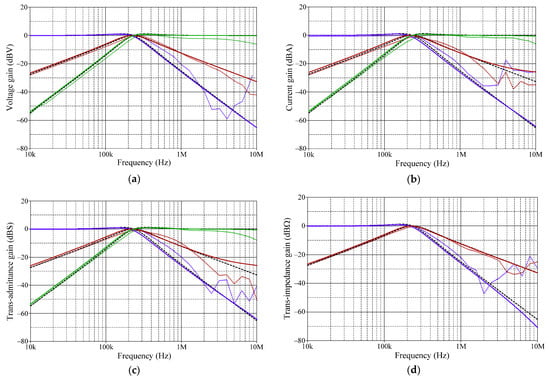 The non-ideal behavior model of the VDGA including finite parasitic impedances at each terminal is represented in Figure 5. These parasitics consist of resistance in parallel with capacitance for the p, n, z+, z−, x and o terminals, and serial resistance at the w terminal [,,]. Because of the presence of these undesired parasitics, the circuit performance may differ from ideality. As a result, the suggested circuits in Figure 3 and Figure 4, including the VDGA parasitics, must be thoroughly examined.