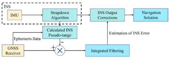 In the tightly coupled GNSS/INS integration model, the INS module solves the navigation parameters separately, and then performs integrated filtering with the GNSS measurements, and the obtained estimated error is used to correct the INS output. The specific flow chart is shown in Figure 1.