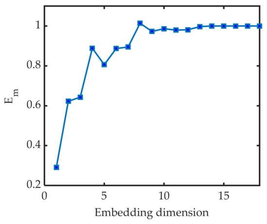 When increases to a certain value, converges to 1 if the sequence has chaotic properties. At this point the attractor of the time series has been completely opened in the phase space, and the increase of the embedding dimension will no longer make the signature sequence contain more information. The variation of in each dimension according to the CAO method is shown in Figure 3. When the dimension reaches 9, the variation is dynamically stable in a small range. At this point, it can be considered that the reconstruction of the time series in this dimension can reflect the change pattern of the original system approximately in the phase space, so the embedding dimension is 9.