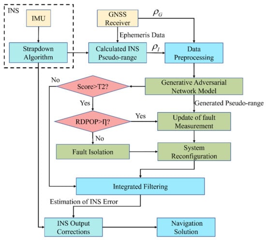 Data fusion in the GNSS/INS integrated system is generally implemented using Kalman filtering algorithms [5], such as the cubature Kalman filter [6] and the unscented Kalman filter [7]. The INS is a self-contained dead-reckoning system that can accomplish navigation tasks independently of external information, which allows it to be free from environmental interference, but its errors will accumulate over time, leading to a rapid drop in positioning accuracy [8]. GNSS can provide the absolute position in real time, but its signal is fragile and susceptible to interference from many environmental factors, such as multipath effects and electromagnetic interference [9,10]. The integrated system exploits the complementary characteristics of both navigation systems, which allows it to obtain superior performance compared to a stand-alone INS or GNSS [11]. In practical navigation applications, complex observation environments often interfere with GNSS measurements. If the fault is not detected or eliminated in time, the performance advantages of integrated system disappears, and the accuracy and reliability of the system is reduced [12]. Therefore, a fault detection and system reconfiguration method that is adaptable to the environment and reliable is essential for the application of combined navigation [13].