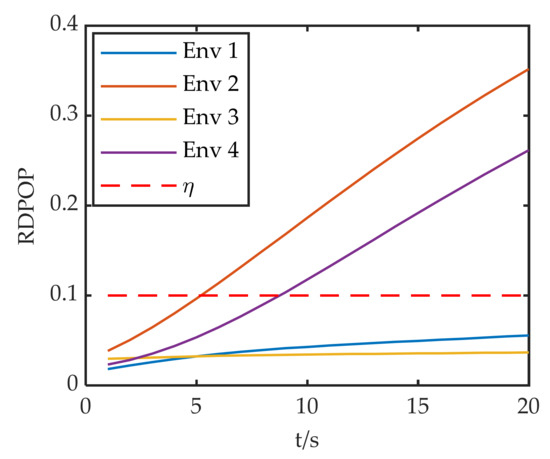 The RDPOP of the faulty satellite in each environment is shown in Figure 7, with set to 0.1. The system reconfiguration is performed using the fault isolation (FI) and fault adaptation (FA) described in detail in Appendix B and Appendix C, respectively. The positioning errors in each environment during the fault are shown in Figure 8.