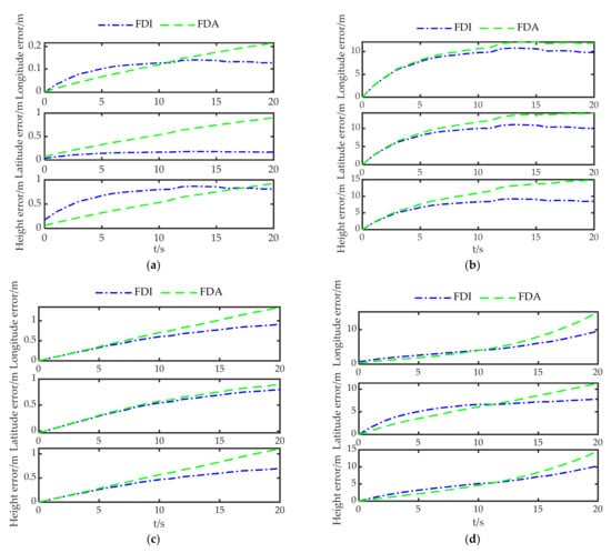 Positioning errors in each environment during the fault. (a–d) are the positioning errors under Env1, Env2, Env3 and Env4, respectively.