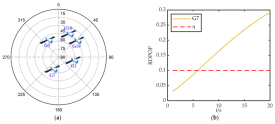 In order to verify the advantages of the method proposed in this paper, a fault is added to the measurement of G7 during 300–360 s. The configuration of the satellites and the RDPOP of G7 are shown in Figure 9. Two additional methods are introduced for comparison. One is the fault detection and isolation method (FDI), and the other is the fault detection and adaptation method (FDA). The fault detection methods for FDI and FDA are given in Appendix A, and their system reconfiguration methods are FI and FA respectively.
