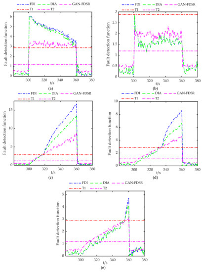 Fault detection functions for three methods: (a–e) show the fault detection functions under Type 1, Type 2, Type 3, Type 4 and Type 5 faults, respectively.