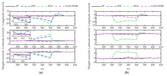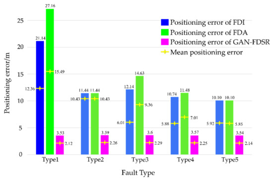 Considering that there will be a certain amount of error even if the system is fault-free, Figure 12 shows the errors of the three methods under each fault type relative to fault-free system to analyze the positioning accuracy quantitatively. Although the fault in Type 1 was identified, the positioning errors of FDI and FDA were the largest among all the types, which demonstrates once more that caution is necessary in handling fault observations when the observation environment is poor. However, the errors of GAN-FDSR are quite close under each type and much lower than the other methods as the integrated system benefits from the timely reconfiguration of the measurements and the small error in the generated data.