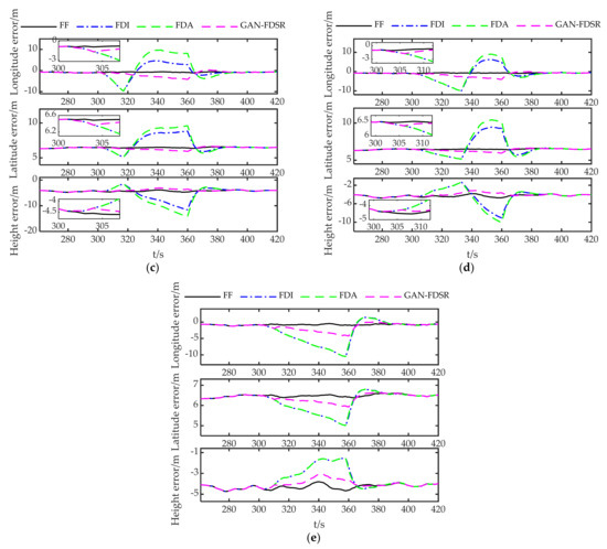 The types of faults in the integrated navigation can be roughly divided into large-amplitude faults, small-amplitude faults and gradual faults. Large-amplitude faults are simple to detect due to rapid and large changes, whereas small-amplitude faults and gradual faults are a problem in fault detection due to their small initial amplitude. To test the GAN-FDSR fault detection performance, five fault types are set which contain two step faults and three gradual faults. The specific fault parameters are shown in Table 4. The false alarm rate is 0.001 in the experiment. The detection threshold for FDI and FDA is 2.88, denoted as , according to Appendix A. The detection threshold for GAN-FDSR is 1.2, denoted as .