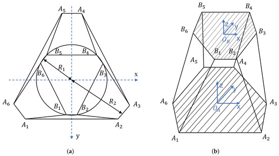 According to Figure 1, the coordinates of the six lower hinge points are defined as , the coordinates of the six upper hinge points are . is the length of the link between the connection point and at initial state. The radii of the six lower- and higher-hinge points are and respectively, as shown in Figure 2.