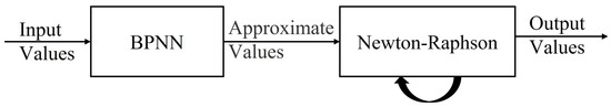 In the traditional hybrid algorithm (BPNN and numerical algorithm), Newton–Raphson is used as the main method for numerical solutions. Some other improved Newtonian methods are used for the numerical iteration of optimization algorithms, as shown in Figure 4.
