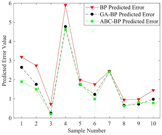 According to the metrics given in Table 3, the ABC algorithm optimized the initialization weights well, which improved the prediction ability of the BPNN model. Compared with GA–BPNN and BPNN, the RMSE index of ABC–BPNN decreased by 42.1% and 31.4%, respectively, and the performance of ABC–BPNN improved by 11.0% and 5.6%, respectively. The average error of the three models is given in Table 4; the maximal improvement of ABC–BPNN error optimization was 46.3%. By comparing the average error, the ABC algorithm could reduce the average error of various variables, and its effect was better than that of the genetic algorithm. Experimental results show that ABC–BPNN could reduce the dependence on the dataset and the prediction error of the neural network.