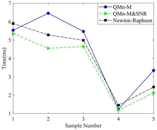Furthermore, we found the percentage improvement performance of other iterative algorithms by comparing with QMn-M and SNR, which is illustrated in Table 7. Compared to NR-hd, the maximal percentage improvement in performance for the average number of iterations and required time was 68.8% and 70.60%, respectively. Compared to NR, the minimal percentage improvement in performance for the average number of iterations and required time was 14.4% and 13.9%, respectively.