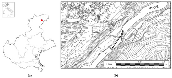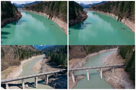 Before conducting the flyover, it is necessary to visit the site in order to check for obstacles and to establish the shooting height and angle. The chosen body of water for this study was the Piave River, a tributary to the Centro Cadore Lake, which is an artificial lake in the province of Belluno (Italy), see Figure 2a. The choice fell on this river for several reasons. Firstly, the height of the free water surface of the river is related to the height of the upstream lake, which is artificially controlled. For this reason, it is possible to know in advance the height of the free water surface at any time of the day. Moreover, this river is particularly suitable for the test because it is a perfect real-life case study, not easily accessible and full of disturbing elements such as tall trees, pylons, bridges, rocks and bends. In addition, the lake undergoes lamination throughout the year and the water level can vary more than 10 m during the course of the year.