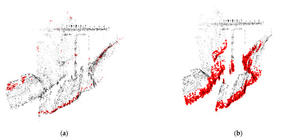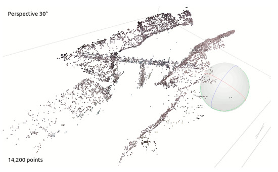 This condition is not very frequent and its effects can be minimized with the appropriate choice of the UAV’s mission paths. Furthermore, although the point clouds are not of very good quality when they are viewed at glance, the algorithm that is proposed in this article is quite immune to this problem by focusing on a plane that contains a dense population of points, which does not necessarily define a half-space.