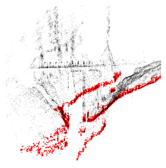 Black dots = point cloud. Red dots = river water surface plane inlier points.