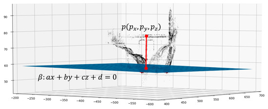 Knowing the positions of the previously selected point and the equation of the plane belonging to the water surface plane, the altitude (above sea level) of the river water’s free surface is easily calculated by subtracting the altitude of point from the distance point-plane and (Figure 6, Equation (1)). This approach also works well in all of the cases wherein the resulting point cloud is randomly skewed because the distance that is calculated is always perpendicular to the target plane.