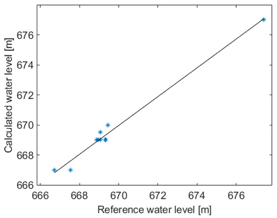 Thus, by the exploitation of the optimal parameters, the comparison with the data that were provided by the manager of the dam upstream of the river shows an accuracy level of around 100%. In fact, the linear fit of the values of the water level shows a slope of 0.95 and a standard deviation of 0.37 m; see Figure 7. Similarly, accurate results can also be obtained by LIDAR-based techniques, as shown in Paul [31], wherein a relative error of 0.1% is declared in spite of the low reflectivity of the air–water interface to near infrared radiation (NIR). However, LiDAR methods are expensive and extensive field data collection can be an extremely challenging task for large river studies [11].