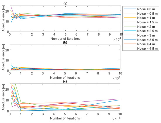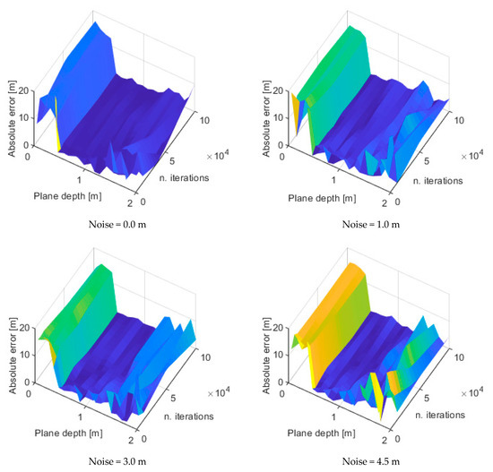 The maps of the absolute levels at different noise levels that were simulated on the point clouds are reported in Figure 9. It can be deduced that the optimal plane depth is 0.5 m since, from this value, the error level exhibits a drop from a maximum of 20 m to a mean value of 4.9 m. The error increases with the increase in the plane depth but it is not affected by the number of iterations. From the previous maps it is possible to extract slices at different number of iterations, for instance 1000, 10,000 and 100,000, showing the trend of the absolute error in the function of the plane depth, for the different noise levels. Those trends are illustrated in Figure 10 which show that, for a low number of iterations—see Figure 10a, the absolute error assumes important levels, except in the case of plane depths between 0.4 and 0.7 m. When the number of iterations increases, for instance up to 100,000—see Figure 10c, the absolute error decreases regardless of the noise level, even if the minimum error is always concentrated as it is in the cases of plane depths between 0.4 and 0.7 m.